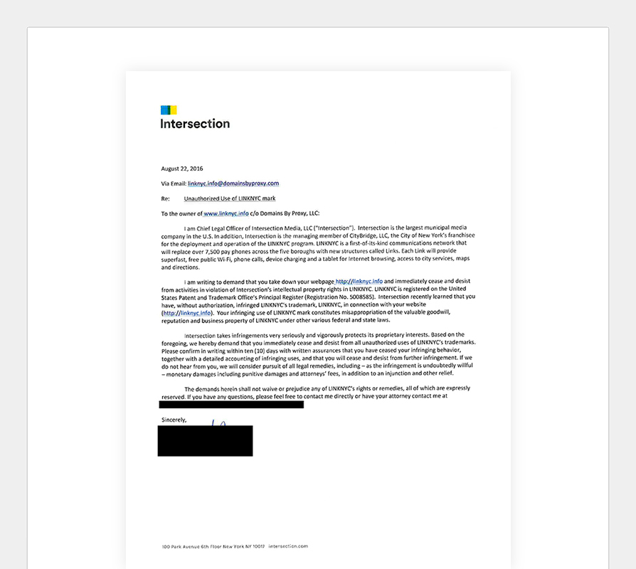 August 22nd 2016: A cease and desist letter was received from LinkNYC managing company Intersection asking for the removal of the work from http://linknyc.info.