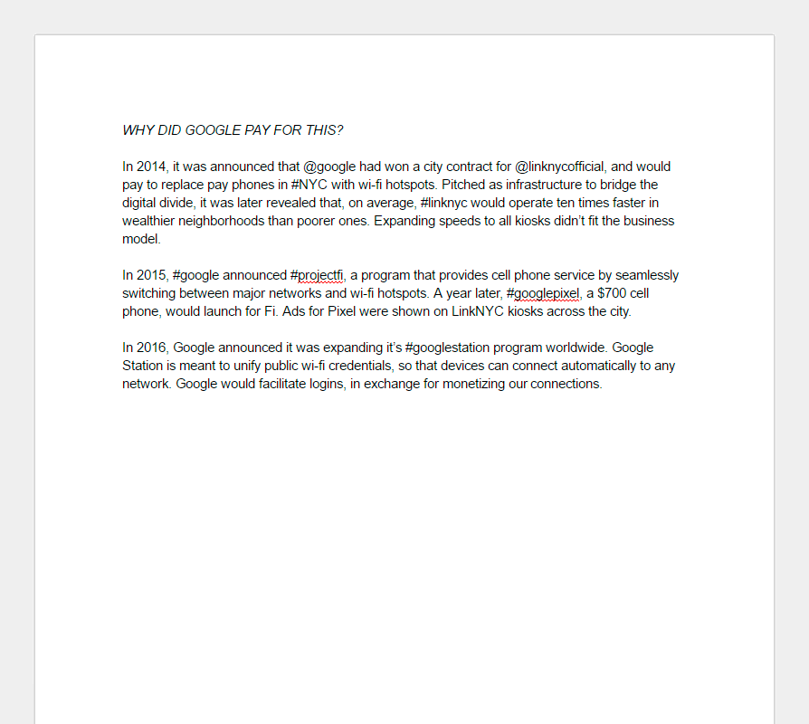 September 15th 2016: Internet browsing was removed from all LinkNYC kiosks following complaints that the feature, pitched as a bridge for the digital divide, was too popular with houseless people.